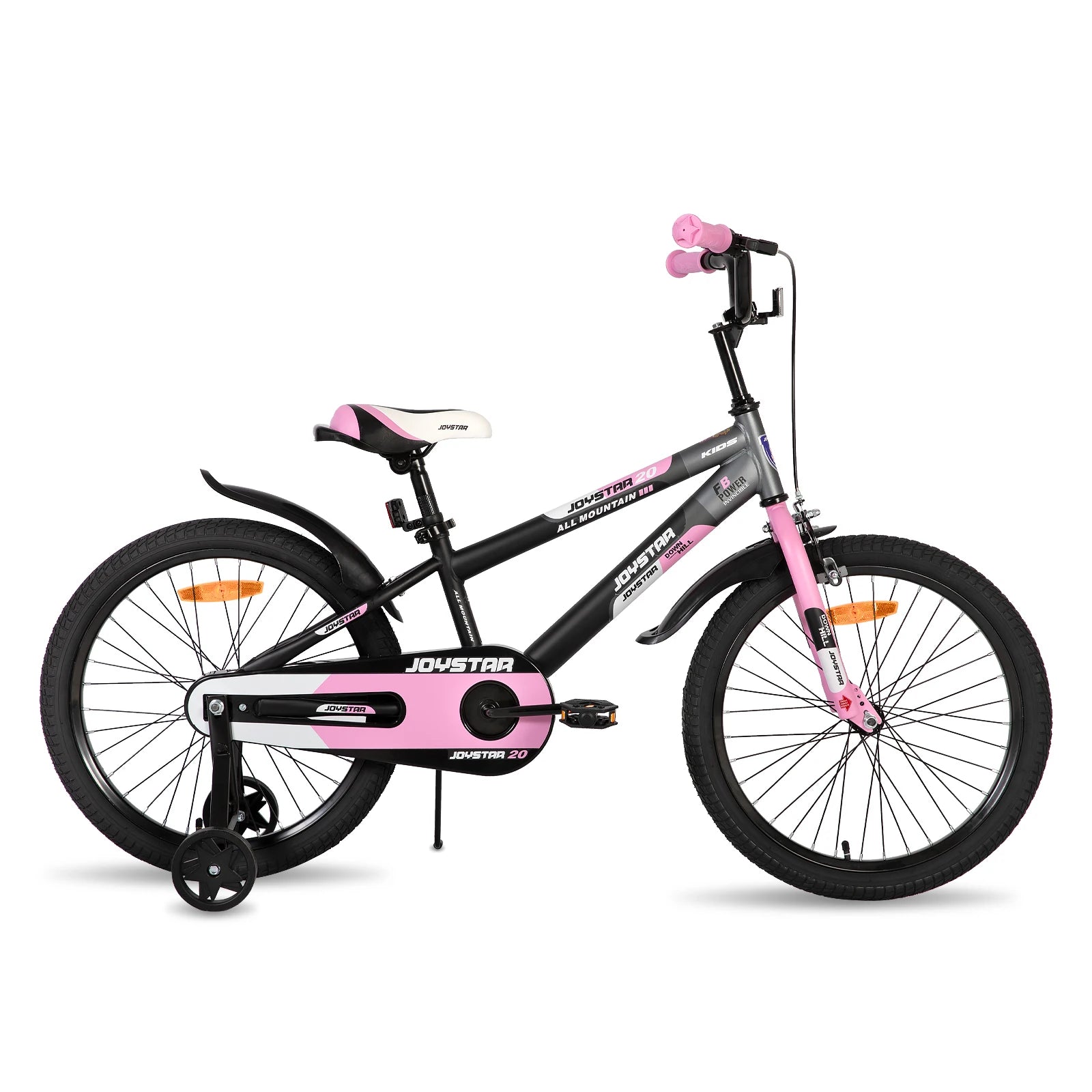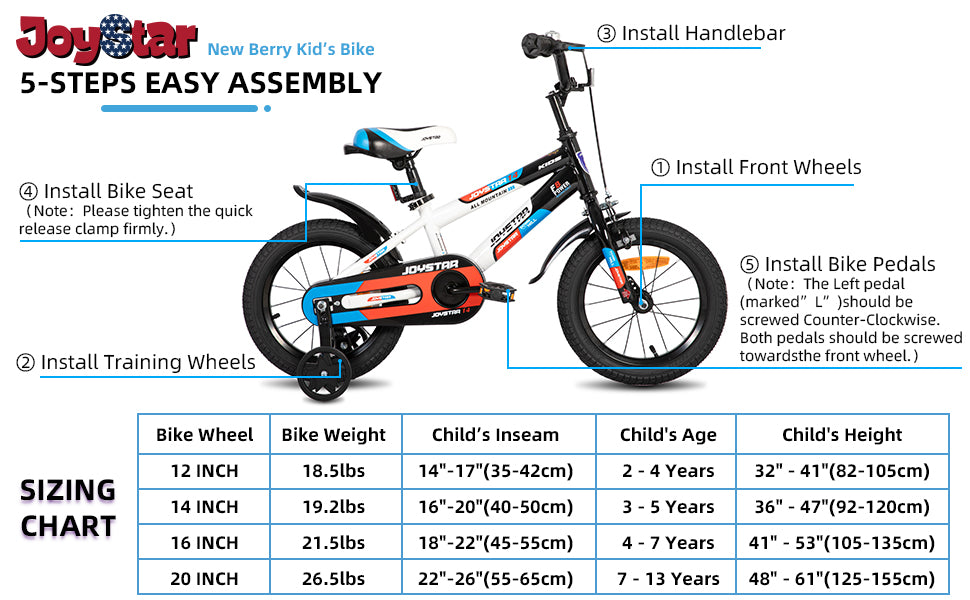Sturdy Steel FrameJoystar Tough HI-TEN steel frame is durable and elegant, easily survives the multiple bumps, keeping kids ride smooth and easy. | Ergonomic Comfort SeatBike seat was designed to give your kids the most COMFORTABLE and SAFE ride as well as the best riding experience ever. The saddle comes with a holder, parent help their little one by grap it. The seat post is tighted with the quick release clamp. | Solid Training WheelsWith heavy-duty steel brackets, training wheels offer increased durability to Help keep your little on upright while learning to ride. This little extra help will support them as they learn to master two wheels. |