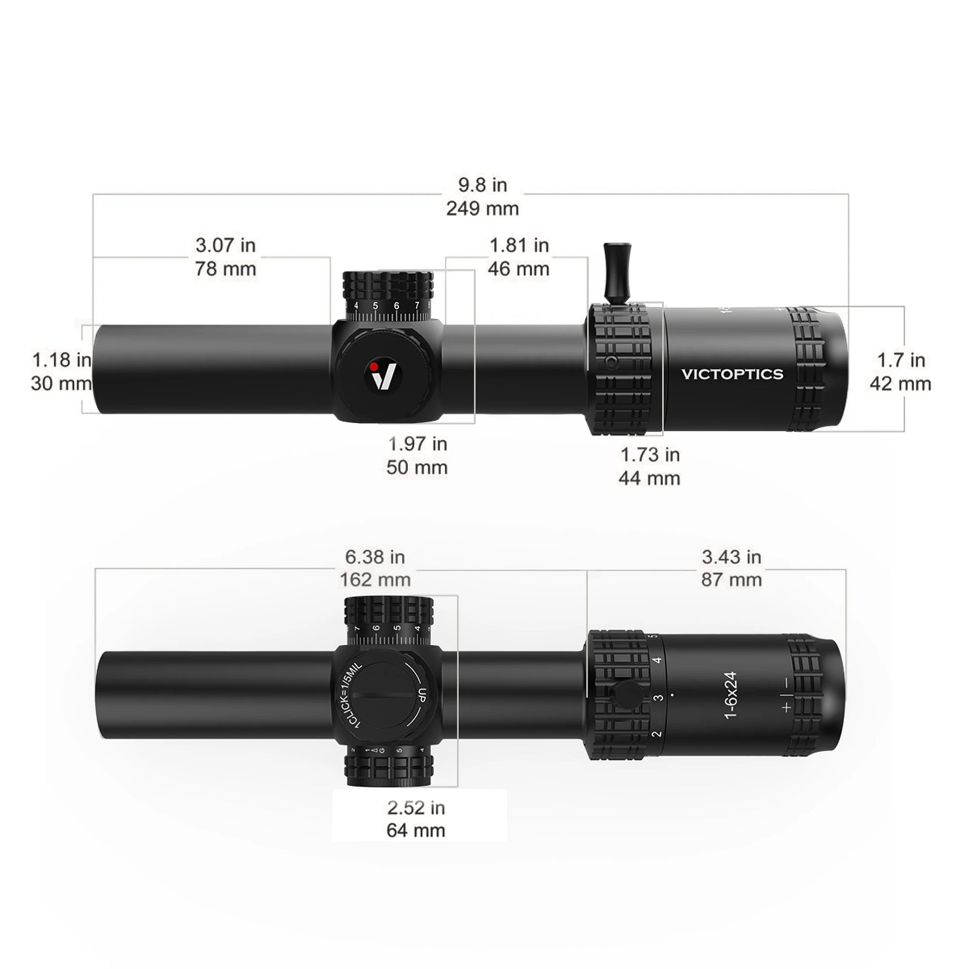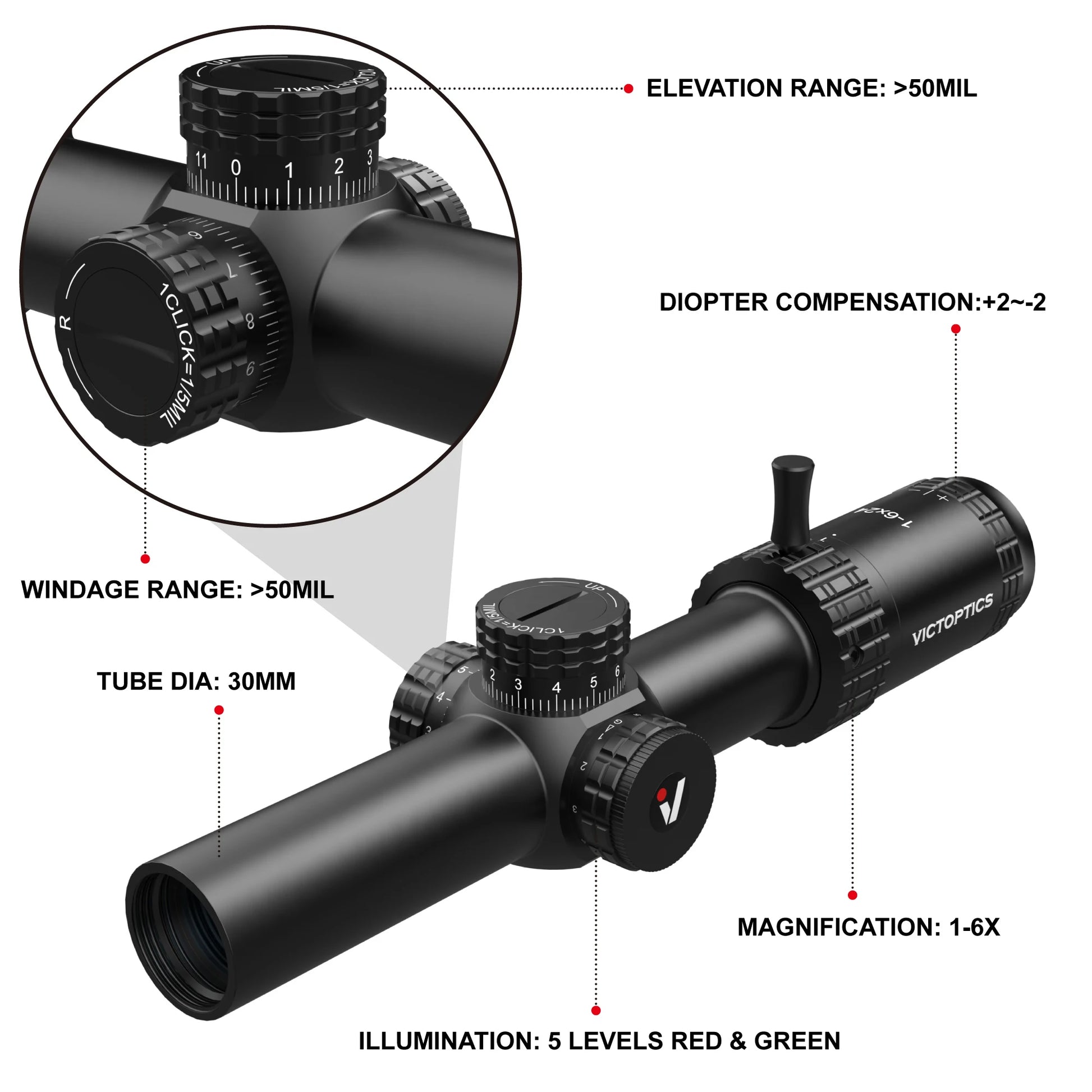 - Your VI-CTSIX etched reticle stays crisp in all zoom levels, with five red/green illumination levels so you can see your aiming point in dawn, dusk, or bright sun.